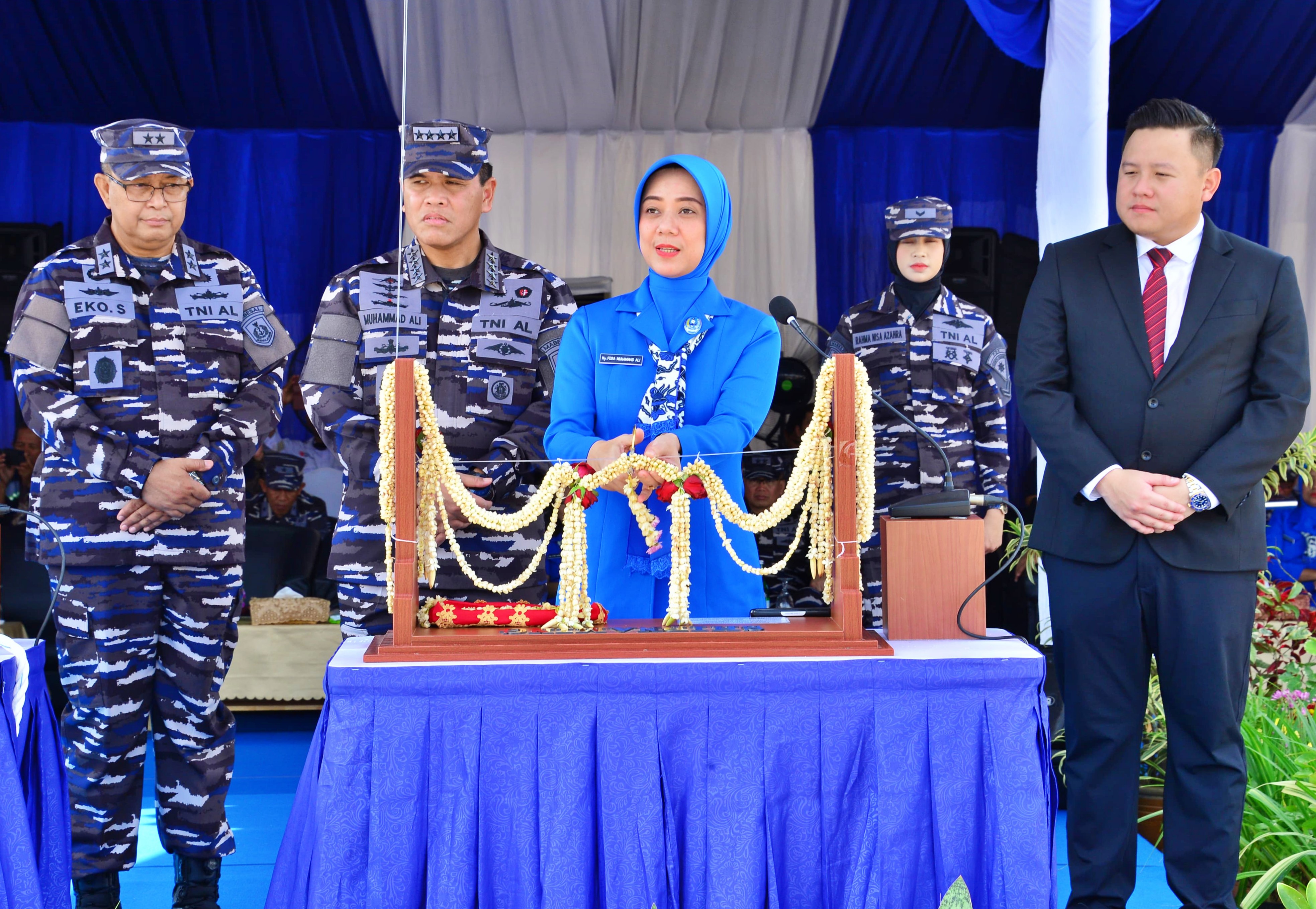 Ketua Umum Jalasenastri Ny. Fera Muhammad Ali mendampingi Kepala Staf Angkatan Laut Laksamana TNI Dr. Muhammad Ali melaksanakan shipnaming dan launching KRI Butana-878 dan KRI Selar-879 di Galangan Kapal PT. Citra Shipyard Kepulauan Riau Batam, pada hari Selasa tanggal 7 Mei 2024.
