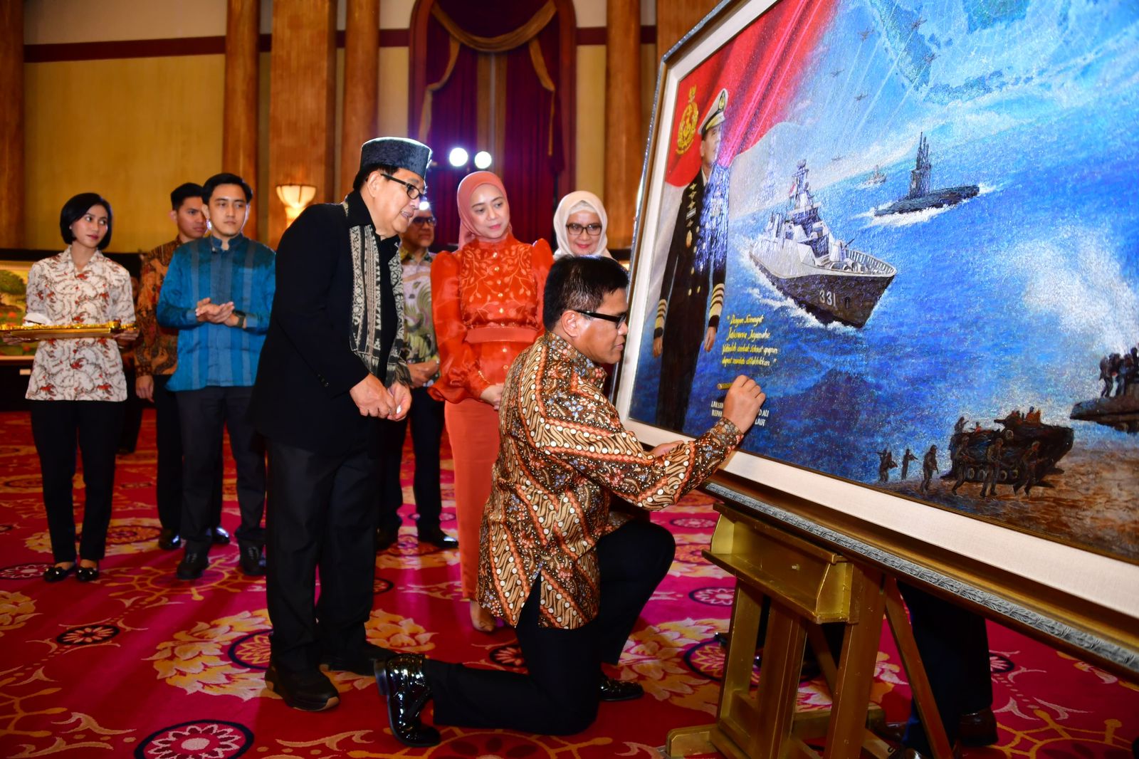 Ketua Umum Jalasenastri, Ny. Fera Muhammad Ali, mendampingi Kepala Staf Angkatan Laut, Laksamana TNI Muhammad Ali, S.E., M.M., M.Tr.Opsla., membuka pameran lukisan bertajuk “Padamu Negeri” di Balai Samudra, Jakarta Utara, pada Senin, 2 September 2024.