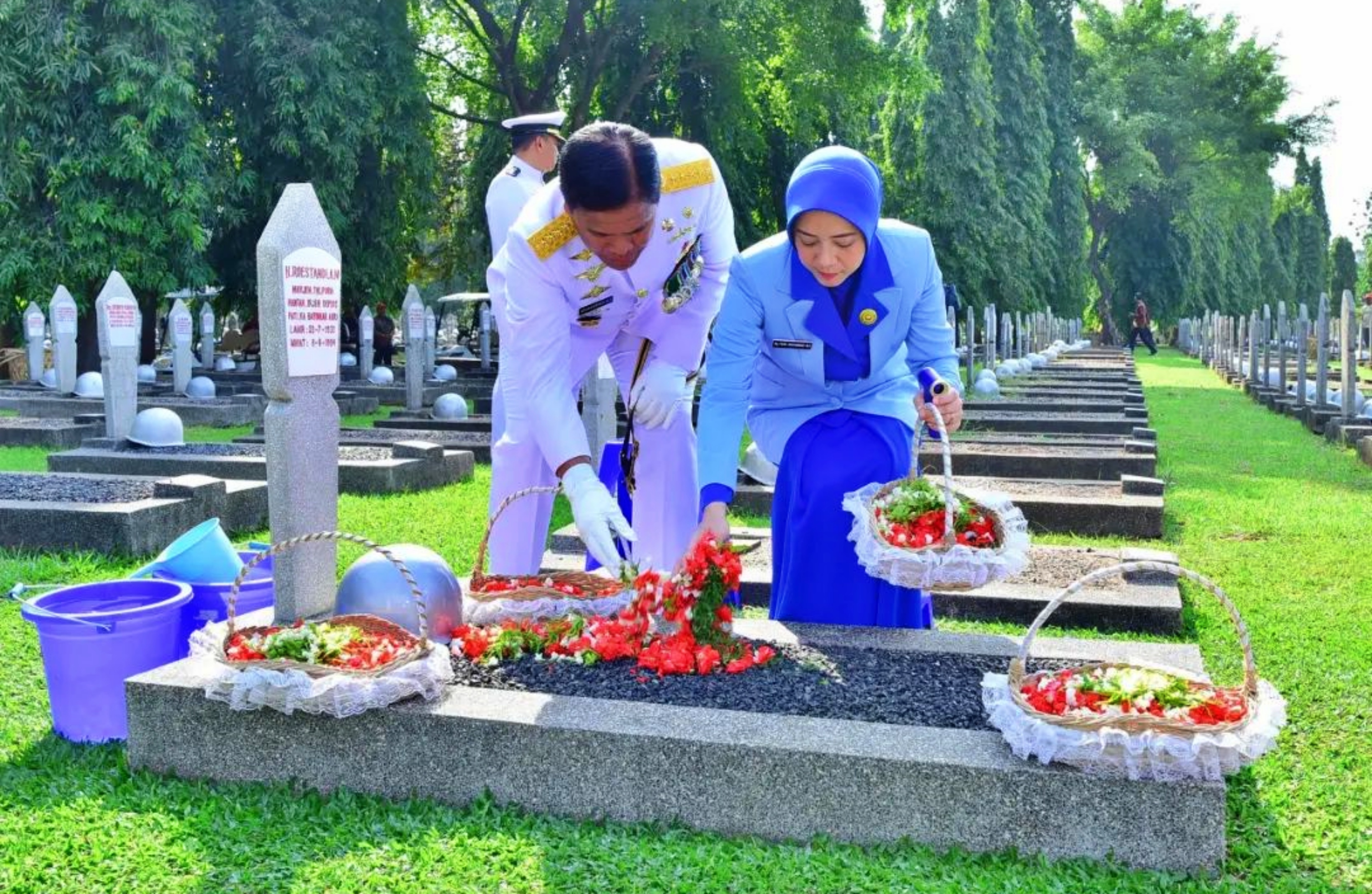 Ketua Umum Jalasenastri, Ny. Fera Muhammad Ali, mendampingi Kepala Staf Angkatan Laut, Laksamana TNI Dr. Muhammad Ali, S.E., M.M., M.Tr.Opsla, dalam upacara ziarah peringatan HUT Ke-79 TNI Tahun 2024 di Taman Makam Pahlawan Utama Kalibata, Jakarta Selatan, pada Jumat (4/10/2024).