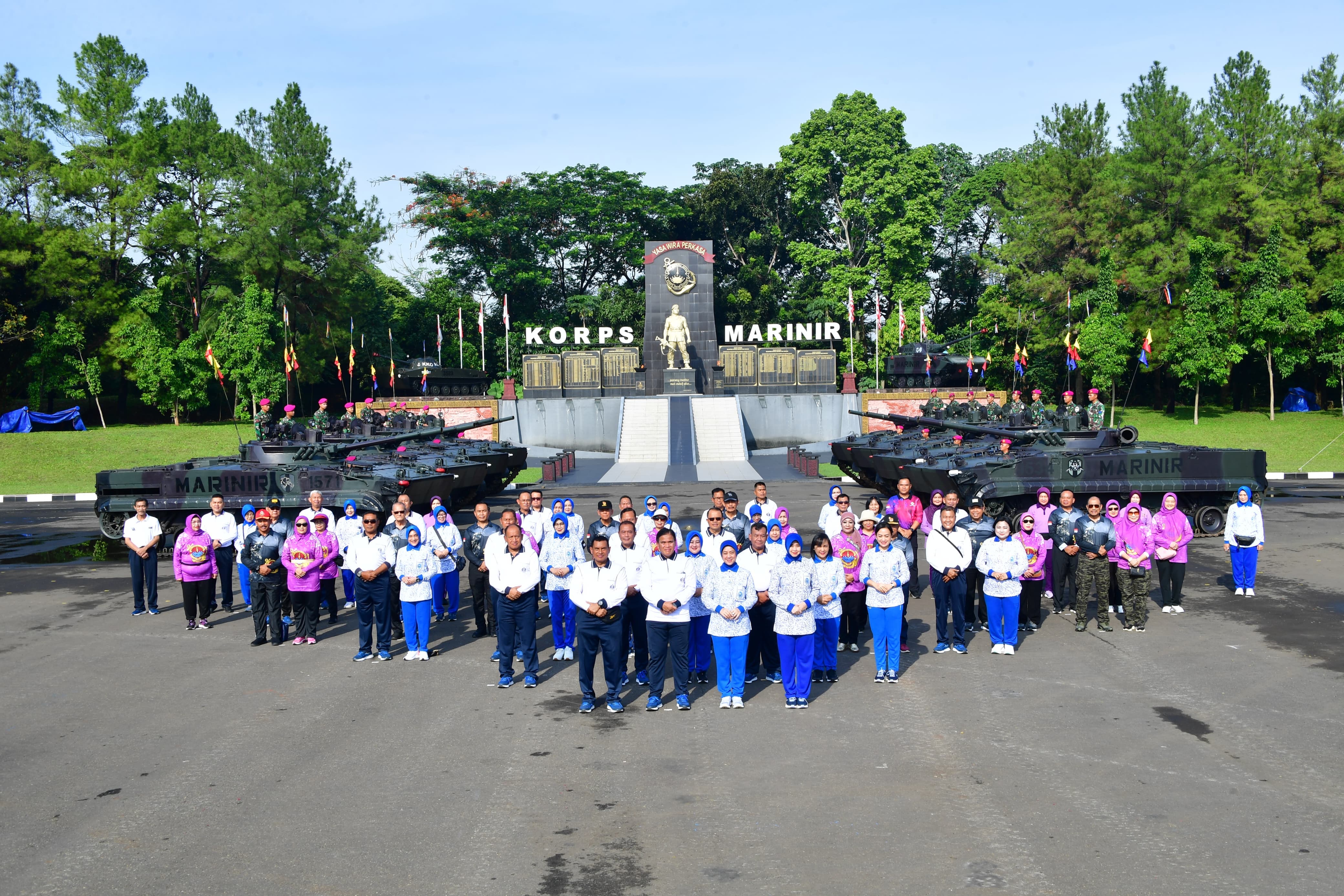 Ketua Umum Jalasenastri Ny. Fera Muhammad Ali mendampingi Kepala Staf Angkatan Laut (Kasal) Laksamana TNI Dr. Muhammad Ali, S.E., M.M., M.Tr.Opsla dalam acara olahraga bersama dengan prajurit Korps Marinir. Kegiatan ini dilaksanakan di Brigif 1 Marinir, Jakarta Selatan, pada 12 November 2024.