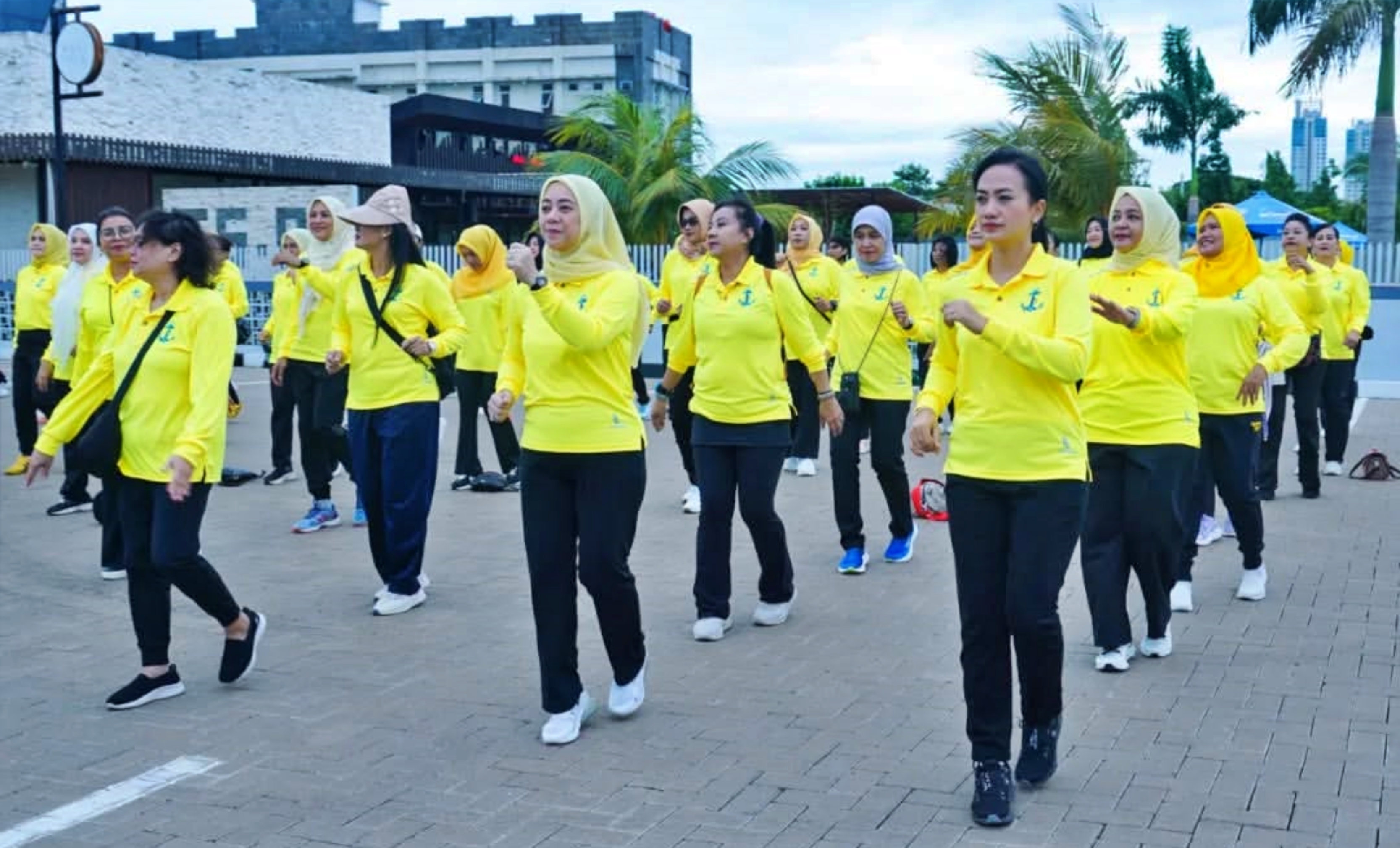 Ketua Umum Jalasenastri, Ny. Fera Muhammad Ali, mengikuti kegiatan olahraga bersama dengan anggota Jalasenastri yang mendampingi dinas suami di luar struktural TNI AL. Kegiatan ini bertempat di Kantor PP Jalasenastri Kodamar, Jakarta Utara, Selasa 3 Desember 2024.