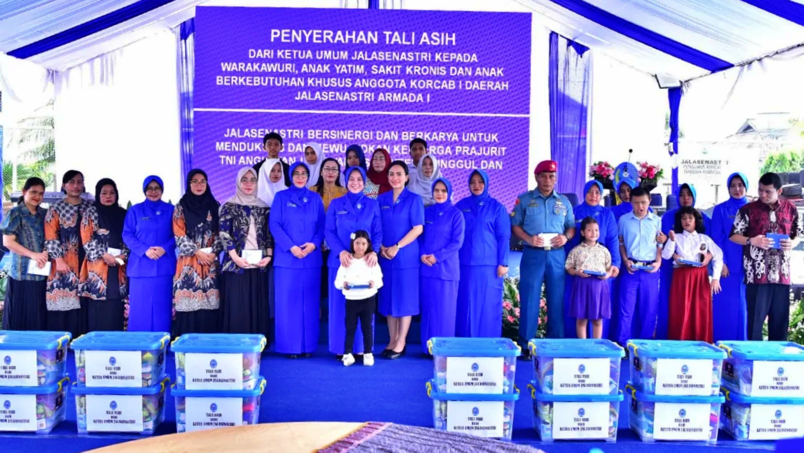 Kegiatan sosial ini diwujudkan dalam bentuk tali asih sebagai wujud kasih sayang dan kepedulian Ketua Umum Jalasenastri kepada warakawuri, anak yatim, dan anak-anak berkebutuhan khusus.