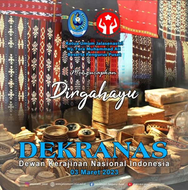 Semoga DEKRANAS dapat menambah dan menjunjung nilai seni budaya yang terkandung dalam wujud barang kerajinan dan wastra sebagai salah satu manifestasi kepribadian dan identitas bangsa.