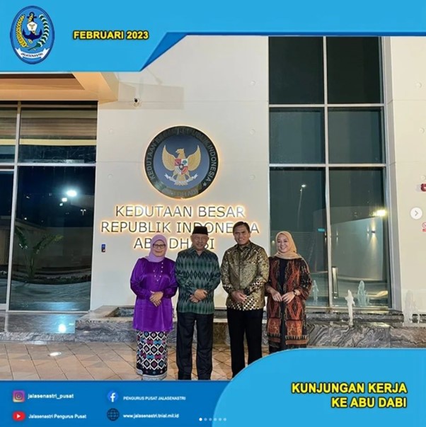 Ketua Umum Jalasenastri Ny. Fera Muhammad Ali mendampingi Kepala Staf Angkatan Laut, Laksamana TNI Muhammad Ali S.E.,M.M.,M.Tr.Opsla. kunjungan ke Abu Dhabi dalam rangka menghadiri giat NAVAL DEFFENCE EXIBITION di Abu Dhabi Uni Arab Emirat.