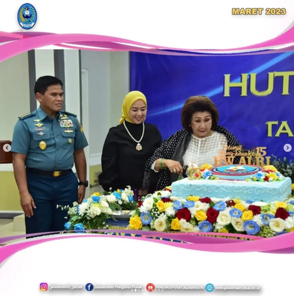 Ketua Umum Jalasenastri Ny. Fera Muhammad Ali mendampingi Kepala Staf Angkatan Laut, Laksamana TNI Muhammad Ali S.E., M.M., M.Tr.Opsla. menghadiri acara syukuran HUT ke - 15 Himpunan Warakawuri Angkatan Laut RI ( HW ALRI ), bertempat di Gedung Graha Jala Bhakti Pangkalan Jati - Jakarta, pada hari Rabu tanggal 15 Maret 2023.